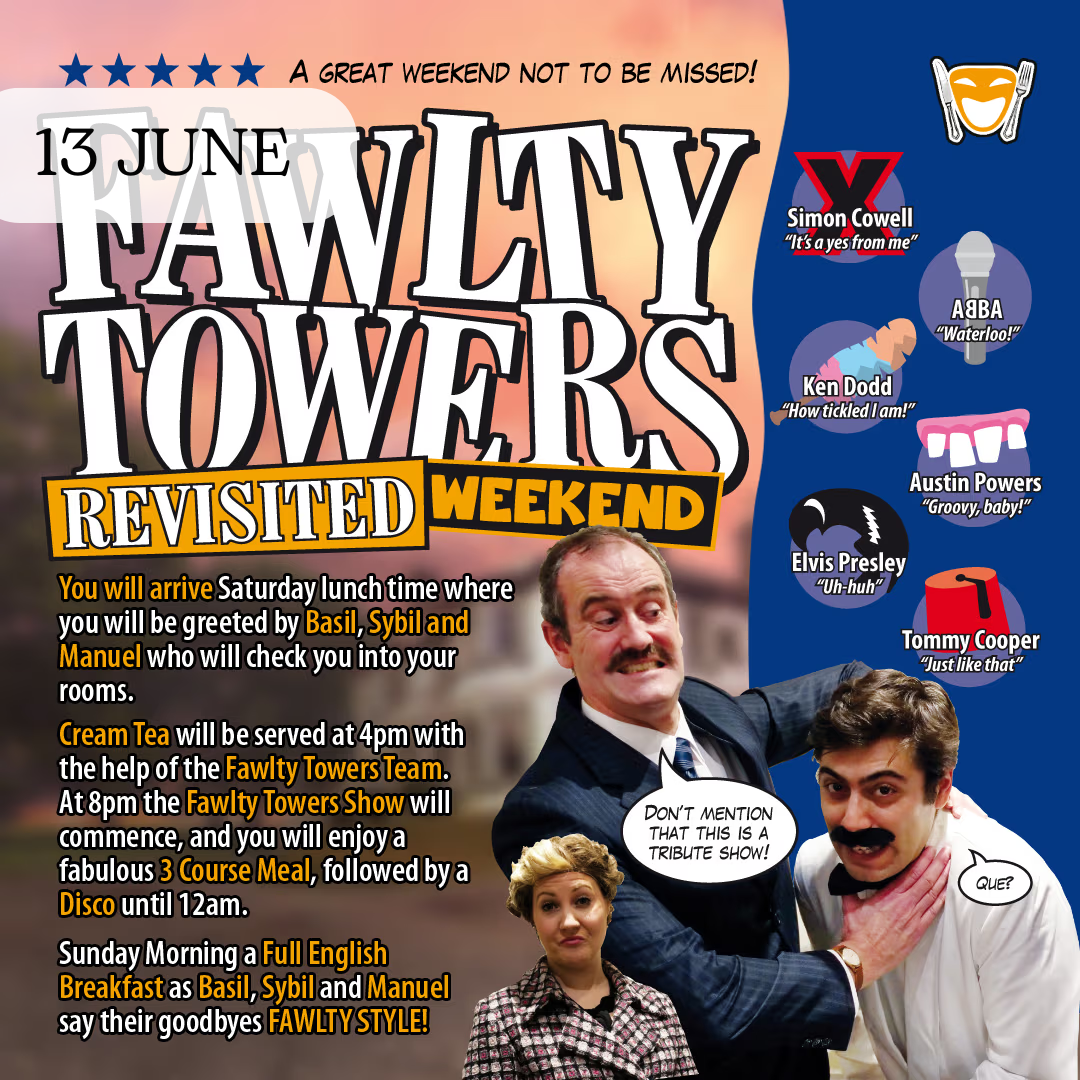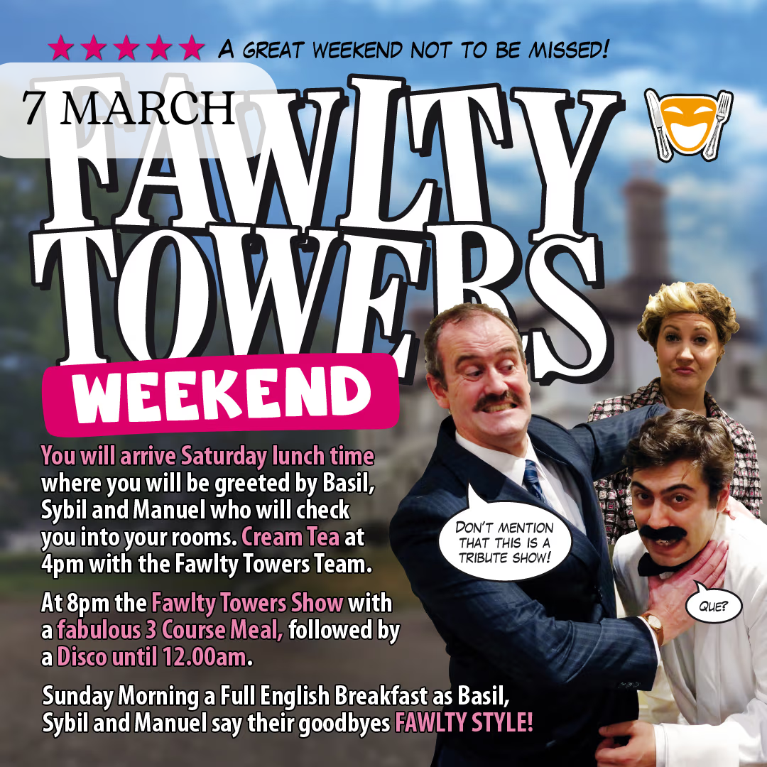 You will arrive Saturday lunch time where you will be greeted by Basil, Sybil and Manuel who will check you into your rooms. Afternoon or Cream tea will be served at 4.00pm with the help of the Fawlty Towers Team. At 8.00pm the Fawlty Towers Show will commence and you will enjoy a fabulous 3 Course Meal, followed by a Disco until 12.00am. Sunday Morning, a Full English Breakfast as Basil, Sybil and Manuel say their goodbyes FAWLTY STYLE!